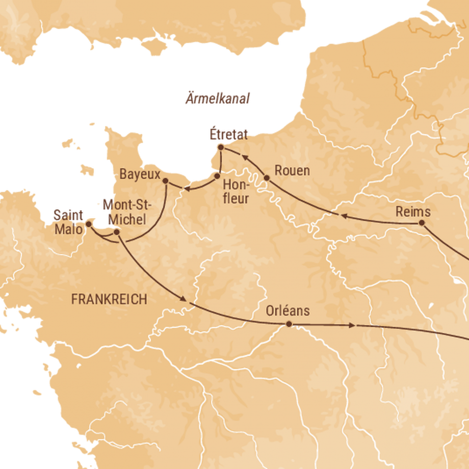 Heute fahren wir durch die weiten Ebenen der Piccardie Richtung Compiègne. Beim Salonwagen, bei dem der Waffenstillstand des Ersten Weltkriegs durch Maréchal Foch unterschrieben wurde, legen wir eine Pause ein. In Beauvais machen wir unseren Mittagshalt. Hier war einst die grösste gotische Kathedrale geplant, die jedoch nie vollendet wurde. Im Laufe des Nachmittags treffen wir in Rouen ein, das stolz den Beinamen «Ville Musée» trägt. Wir unternehmen eine geführte Stadtbesichtigung sehenswert sind der Tour du Gros-Horloge, die Kathedrale oder der Vieux Marché, wo 1431 die «Heilige Jungfrau von Orléans - Jeanne d'Arc» auf einem Scheiterhaufen verbrannt wurde. Wir übernachten im ****Hotel.