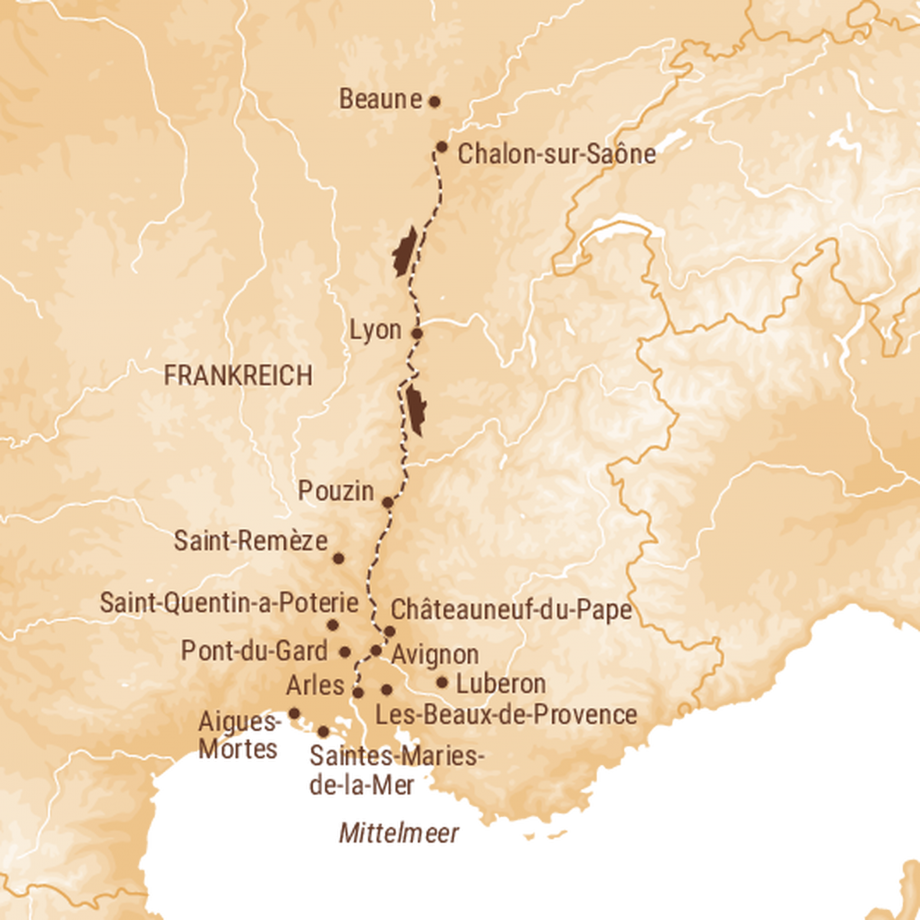 Abreise am Morgen Richtung Westschweiz zum Kaffeehalt und gemeinsamens Mittagessen am Genfersee. Von hier aus ist es nicht mehr weit bis nach Lyon, wo wir auf unser schwimmendes Hotel einchecken und von der Crew herzlich Willkommen geheissen werden. Bereits am Abend gleiten wir auf der Rhône südwärts.