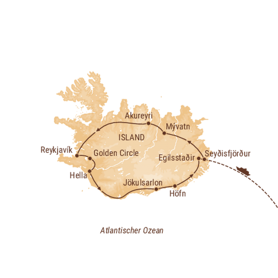 Je nach Wetter machen wir noch eine kleine Rundfahrt in der Region von Egilssatdir. Vielleicht erblicken wir das Flussmonster von Lagarfljot. Im Hafen von Seydisfjördur gehen wir erneut an Bord der Fähre und beziehen unsere Kabinen für die Rückfahrt nach Dänemark.
